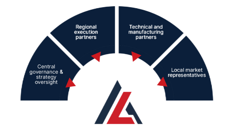 We support clients from strategy to execution through five core divisions, strengthened by global trade capabilities and scalable joint ventures. Our operating model brings together regional execution partners, technical and manufacturing partners, central governance and strategic oversight, and local market representatives to ensure seamless delivery, strong control, and effective market execution across regions.